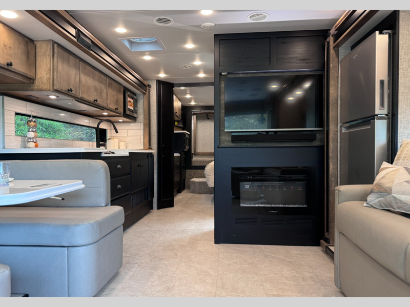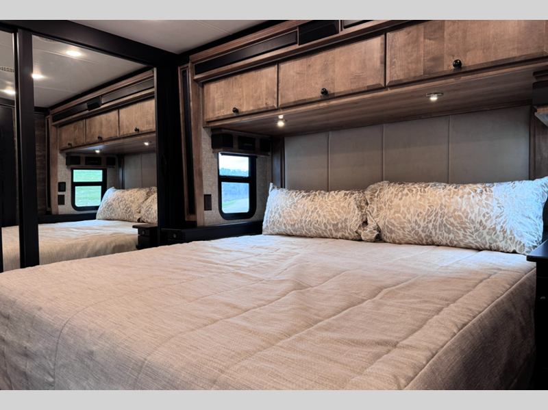 Sleeps 5 Slides 3 Length 33 ft 2 in Ext Width 7 ft 11 in Ext Height 11 ft 8 in Int Height 6 ft 6 in Interior Color Waypoint Exterior Color Fire Opal, Frosted Granite, Rocky Mountain Brown Hitch Weight 5000 lbs GVWR 25500 lbs Fresh Water Capacity 70 gals Grey Water Capacity 50 gals Black Water Capacity 33 gals Tire Size 265/70R19.5 Furnace BTU 60000 btu Generator 6.0 kw Onan Quiet Diesel Fuel Type Diesel Engine Cummins B6.7 Chassis PowerGlide Raised Rail Rear Horsepower 340 hp Fuel Capacity 70 gals Wheelbase 202 in Available Beds King Torque 700 ft-lb Refrigerator Type Stainless Steel Residential with Top Freezer Refrigerator Size 12 cu ft Convection Cooking Yes Cooktop Burners 3 Shower Size 28.5" x 40.5" Number of Awnings 2 Axle Weight Front 9500 lbs Axle Weight Rear 16000 lbs LP Tank Capacity 20 gals Water Heater Type Truma AquaGo Comfort Instant AC BTU 27000 btu Basement Storage 94 cu. ft. TV Info LR TV, BR TV, Exterior TV Awning Info Girard Side-Mounted Power w/Integrated LED Lighting Washer/Dryer Available Yes Gross Combined Weight 30500 lbs Shower Type Standard Electrical Service 50 amp Similar Floorplans