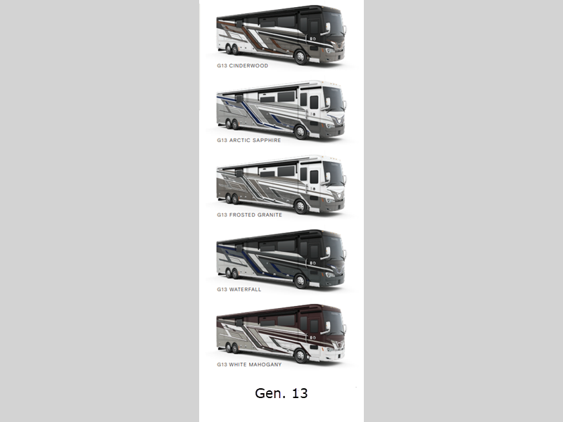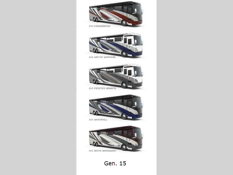 Sleeps 6 Slides 4 Length 41 ft Ext Width 8 ft 5 in Ext Height 13 ft 3 in Int Height 6 ft 11 in Interior Color Omnia, Pacifica, Taos Exterior Color Gen 13, Gen 15; Cinderwood, Arctic Sapphire, Frosted Granite, Waterfall, White Mahogany Hitch Weight 10000 lbs GVWR 42000 lbs Fresh Water Capacity 100 gals Grey Water Capacity 100 gals Black Water Capacity 55 gals Tire Size 315/80R22.5 Generator 10 kW Onan Quiet Diesel Fuel Type Diesel Engine Cummins L9 Chassis PowerGlide XC Raised Rail Rear Engine Horsepower 450 hp Fuel Capacity 150 gals Wheelbase 276 in Available Beds King Torque 1250 ft-lb Refrigerator Type Stainless Steel Residential with French Doors and Bottom Freezer Refrigerator Size 25 cu ft Convection Cooking Yes Cooktop Burners 2 Number of Awnings 2 Axle Weight Front 18000 lbs Axle Weight Rear 24000 lbs Water Heater Type Hydronic AC BTU 45000 btu Basement Storage 229 cu. ft. TV Info LR TV, BR 50" TV, Ext. TV Awning Info Girard Power w/LED Lighting, Manual Window Washer/Dryer Available Yes Gross Combined Weight 52000 lbs Shower Type Standard Electrical Service 50 amp Similar Floorplans