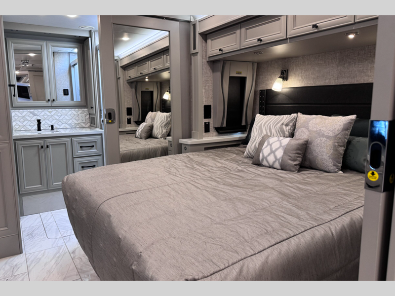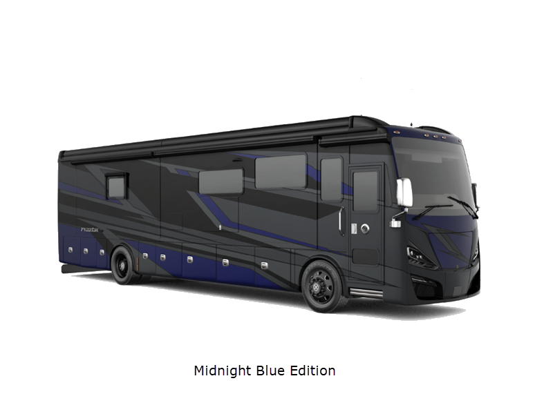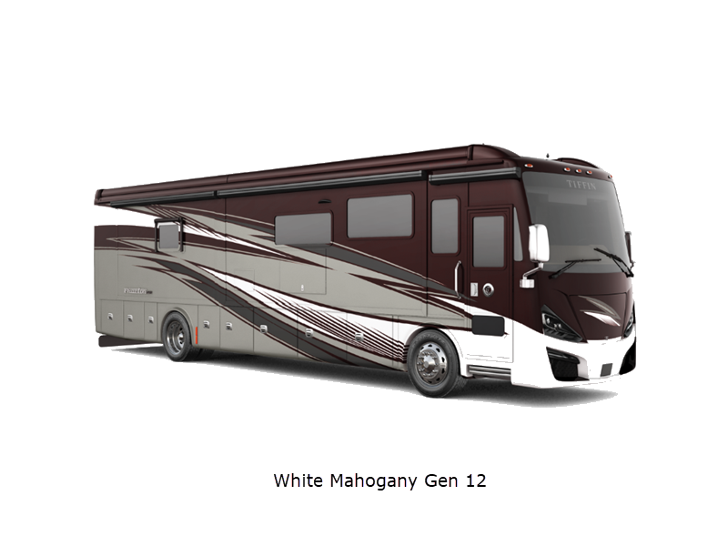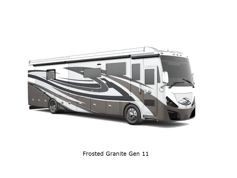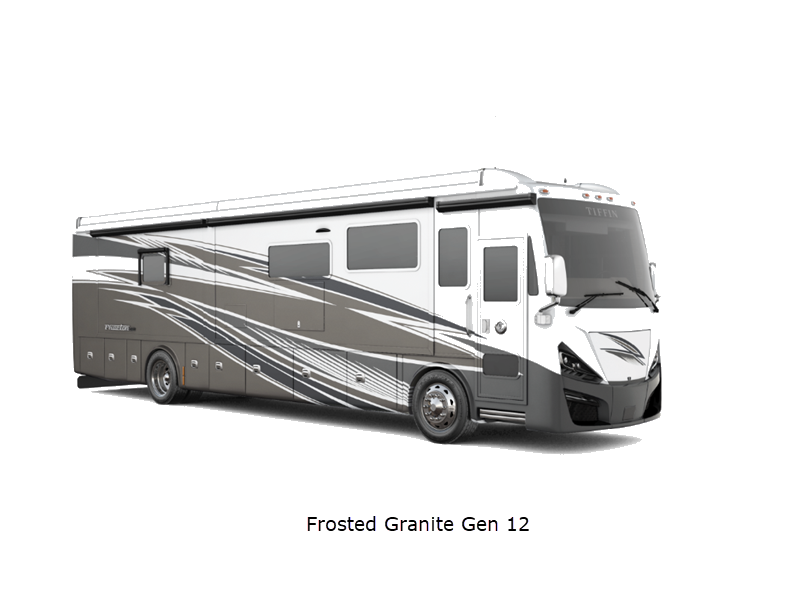 Sleeps 7 Slides 4 Length 41 ft 4 in Ext Width 8 ft 5 in Ext Height 13 ft 3 in Int Height 6 ft 11 in Interior Color Gelato, Mesa, Titanium Exterior Color Gen 10, Gen 11; Bordeaux, Waterfall, Frosted Granite, Nasa, White Mahogany. Midnight Blue Edition Hitch Weight 10000 lbs GVWR 40000 lbs Fresh Water Capacity 100 gals Grey Water Capacity 100 gals Black Water Capacity 55 gals Tire Size 295/80R22.5 Furnace BTU 60000 btu Generator 10.0kW Onan Quiet Diesel Fuel Type Diesel Engine Cummins L9 Chassis Freightliner PowerGlide XC Raised Rail Rear Horsepower 450 hp Fuel Capacity 100 gals Wheelbase 266 in Available Beds King Torque 1250 ft-lb Refrigerator Type Stainless Steel Residential with French Doors and Bottom Freezer Refrigerator Size 25 cu ft Convection Cooking Yes Cooktop Burners 2 Shower Size 31.75" x 40" Number of Awnings 2 Axle Weight Front 16000 lbs Axle Weight Rear 24000 lbs LP Tank Capacity 35.7 gals AC BTU 45000 btu Basement Storage 232 cu. ft. TV Info LR TV, BR Mounted TV, Ext. TV Awning Info Girard Power Patio and Window Washer/Dryer Available Yes Gross Combined Weight 50000 lbs Shower Type Shower w/Seat Electrical Service 50 amp Similar Floorplans